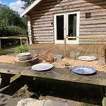 Die 1-Zimmer- Knus Houten Boomstamhuisje Op De Schatberg - Nabij Toverland verfügt über eine Terrasse mit Aussicht auf den Garten sowie einen Außenpool.